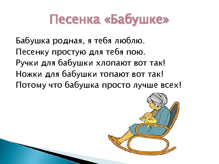 Песенка «Бабушке» Бабушка родная, я тебя люблю. Песенку простую для тебя пою. Ручки для бабушки хлопают вот так! Ножки для бабушки топают вот так! Потому что бабушка просто лучше всех!