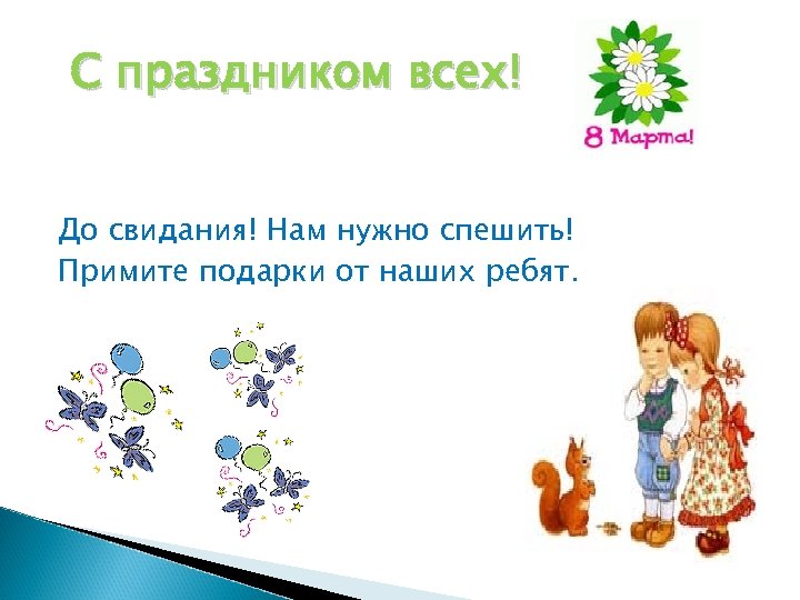 С праздником всех! До свидания! Нам нужно спешить! Примите подарки от наших ребят.