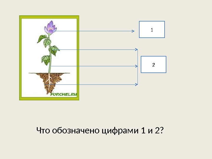 Совокупность всех корней растения называют корневой системой. В случае, когда главный корень незначительно выражен, а придаточные корни выражены значительно, корневая система называется мочковатой. Если главный корень выражен значительно, корневая система называется стержневой. 1 — ? 2 — ?