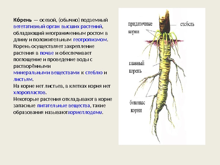 К реньоо — осевой, (обычно) подземный вегетативный орган высших растений , обладающий неограниченным ростом в длину и положительным геотропизмом. Корень осуществляет закрепление растения в почве и обеспечивает поглощение и проведение воды с растворёнными минеральными веществами к стеблю и листьям. На корне нет листьев, в клетках корня нет хлоропластов. Некоторые растения откладывают в корне запасные питательные вещества , такие образования называют корнеплодами.