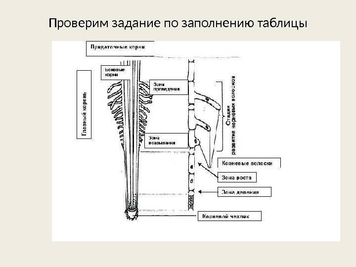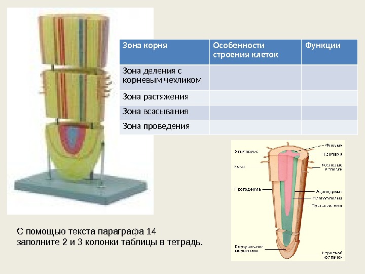 Зона корня Особенности строения клеток Функции Зона деления с корневым чехликом Зона растяжения Зона всасывания Зона проведения С помощью текста параграфа 14 заполните 2 и 3 колонки таблицы в тетрадь.