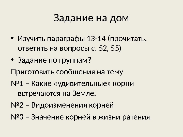 Задание на дом • Изучить параграфы 13 -14 (прочитать, ответить на вопросы с. 52, 55) • Задание по группам? Приготовить сообщения на тему № 1 – Какие «удивительные» корни встречаются на Земле. № 2 – Видоизменения корней № 3 – Значение корней в жизни ратения.