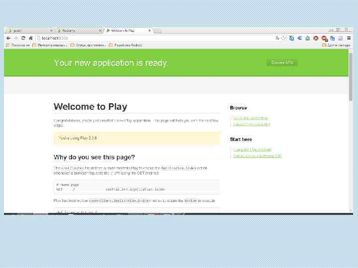 • (примечание с сайта playframework) - Note that choosing a template for either Scala or Java at this point does not imply that you can’t change language later. For example, you can create a new application using the default Java application template and start adding Scala code whenever you like. • Запустим созданный только что проект без GUI командой: • $ activator run • Этой командой activator скачает необходимые инструменты для развертки проекта –например, sbt, скомпилирует исходные файлы на Scala и т. д. • При успешном запуске проекта, обращение к http: //localhost: 9000/ в браузере приведет к следующей странице: