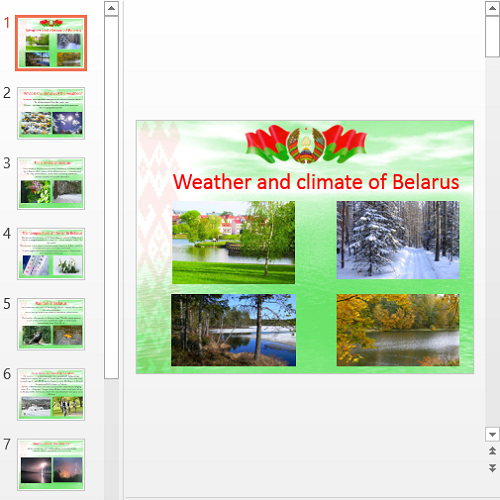 Территория Белоруссии — равнинная местность с небольшими холмами на севере. Здесь своеобразные погодные условия, которые отличаются очень холодными зимами и прохладным летом. Климат Белоруссии переходный от морского к континентальному. Подробнее о нем рассказывается на слайдах представленной вашему вниманию мультимедийной презентации.
