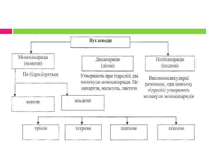 Класифікація вуглеводів 1. Моносахариди — прості вуглеводи, вони не піддаються гідролізу — не розщеплюються водою на простіші вуглеводи. 2. Дисахариди — вуглеводи, які при нагріванні з водою в присутності мінеральних кислот чи під дією ферментів піддаються гідролізу. 3. Полісахариди — це вуглеводи, які багато в чому відрізняються від моносахаридів і дисахаридів і не мають солодкого смаку, і майже не розчинні в воді. 4. Олігосахариди — хімічні сполуки, в яких кілька залишків молекул моносахаридів з'єднані між собою ковалентними зв'язками.
