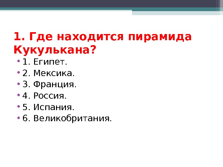 1. Где находится пирамида Кукулькана? • 1. Египет. • 2. Мексика. • 3. Франция. • 4. Россия. • 5. Испания. • 6. Великобритания.