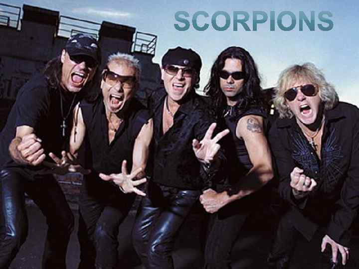 Scorpions Scorpions — легендарная немецкая рок-группа, основана в 1965 году в Ганновере. Для стиля группы характерны как классический рок, так и лирические гитарные баллады. Является cамой популярной рок-группой Германии и одной из самых известных групп на мировой рок-сцене. Наиболее известными композициями группы считаются: «Rock You Like a Hurricane» , «No One Like You» , «Send Me an Angel» , «Still Loving You» и «Wind of Change» . Коллектив занимает 46 -ю строчку в списке «Величайших артистов хард-рока» по версии VH 1. С 2010 года гастролирует с прощальным туром «Get Your Sting And Blackout» , который продлится до 2013 года.