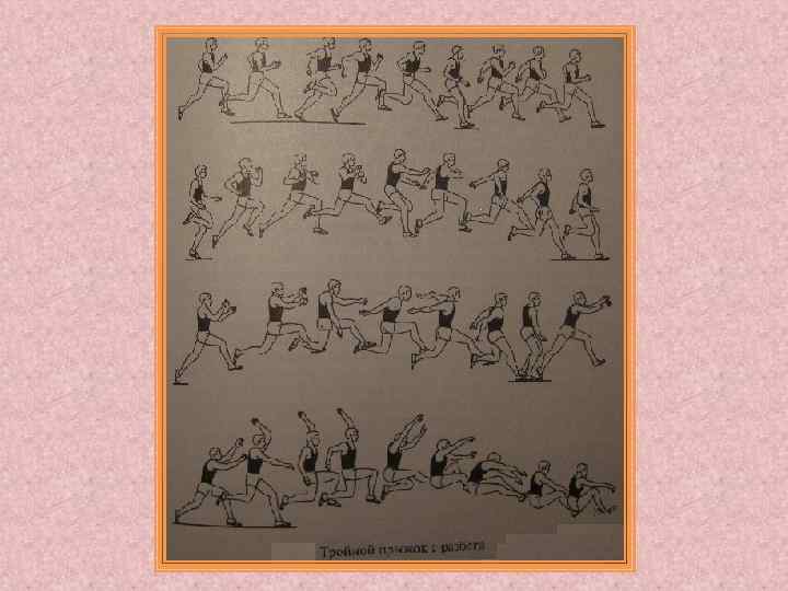 Тройной прыжок Выполняется три прыжка подряд. Три стиля прыжка: 1) «Вертикальный» стиль – характеризуется сильным подтягиванием голени к бедру в полетной фазе и постановкой толчковой ноги по вертикали движением сверху – вниз навстречу дорожке. 2) «Загребающий» стиль – относительно высокий замах бедра с последующим выпрямлением ноги в колене и активная постановка загребающим движением прямой ноги при отталкивании. 3) «Беговой» стиль –разноименная работа рук, быстрое продвижение по прыжку. Нога ставится на отталкивание беговым движением, туловище наклонено вперед, основным является сохранение скорости к третьему отталкиванию, что приводит к увеличению последней части – «прыжку» .