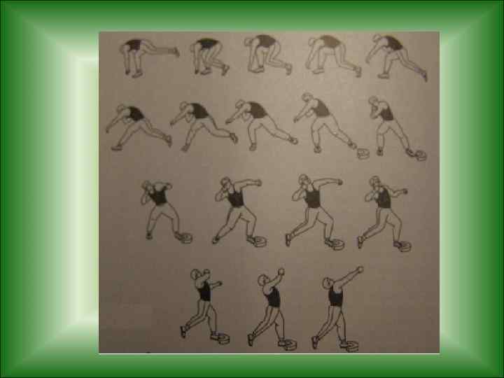 Анализируя технику метания диска, выделяют - Держание снаряда - Исходное положение и предварительные действия - Поворот - Финальное усилие - торможение