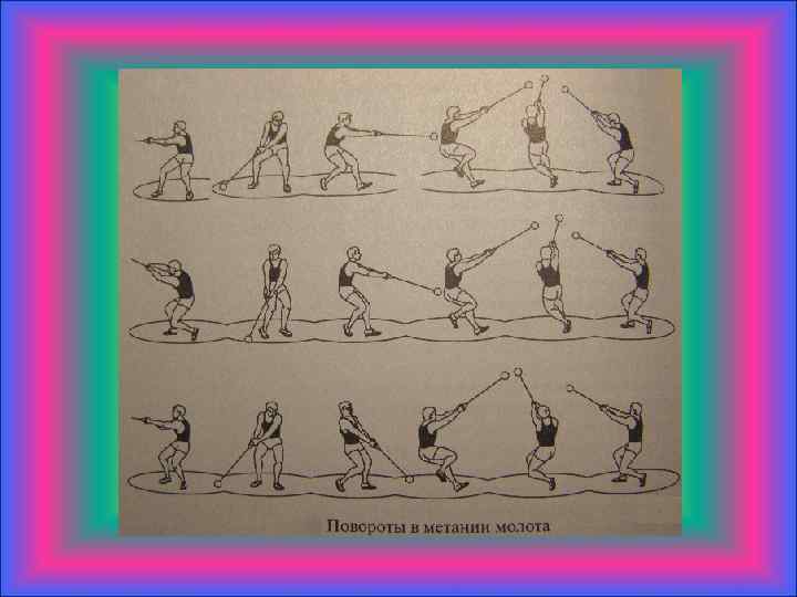 Метание молота Анализируя технику метания молота, выделяют: - Держание молота - Исходное положение и предварительное вращение молота - Повороты метателя с молотом - Финальное усилие - торможение