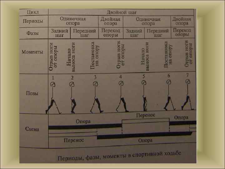СПОРТИВНАЯ ХОДЬБА Ходьба — естественный способ передвижения человека. Спортивная ходьба отличается от простой ходьбы более высокой скоростью передвижения, ограничением техники передвижения правилами соревнований и другими техническими моментами. Основу техники спортивной ходьбы составляет один цикл действия, который состоит из двойного шага, шага левой ноги и шага правой ноги. Цикл содержит: а) два периода одиночной опоры; б) два периода двойной опоры; в) два периода переноса маховой ноги.