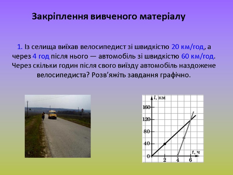 Питання 1. Який вид має графік залежності шляху від часу при прямолінійному рівномірному русі? 2. Чим відрізняються графіки залежності шляху від часу для двох тіл, що рухаються з різною швидкістю? 3. Як за графіком шляху для двох тіл порівняти швидкості їхнього руху? 4. Як за графіком швидкості визначити пройдений тілом шлях?