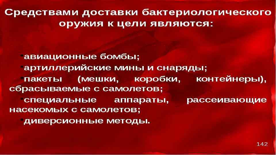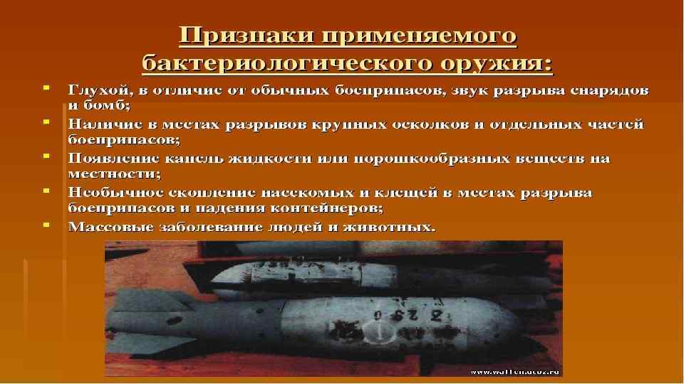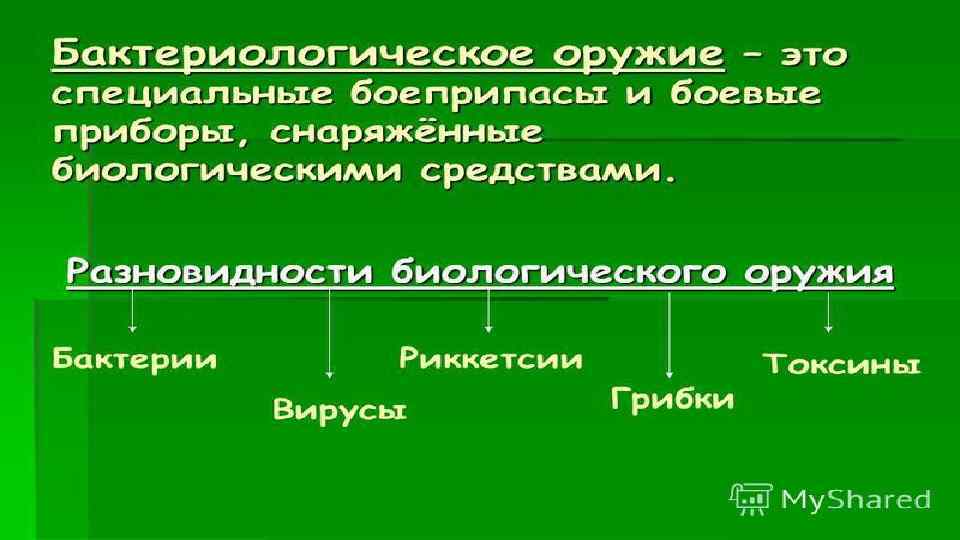 основано на использовании болезнетворных свойств микроорганизмов — возбудителей массовых заболеваний людей, животных и растений. Основой поражающего действия бактериологического оружия являются бактериальные средства — бактерии, вирусы, риккетсии, грибы и токсические продукты их жизнедеятельности, используемые для военных целей с помощью живых зараженных