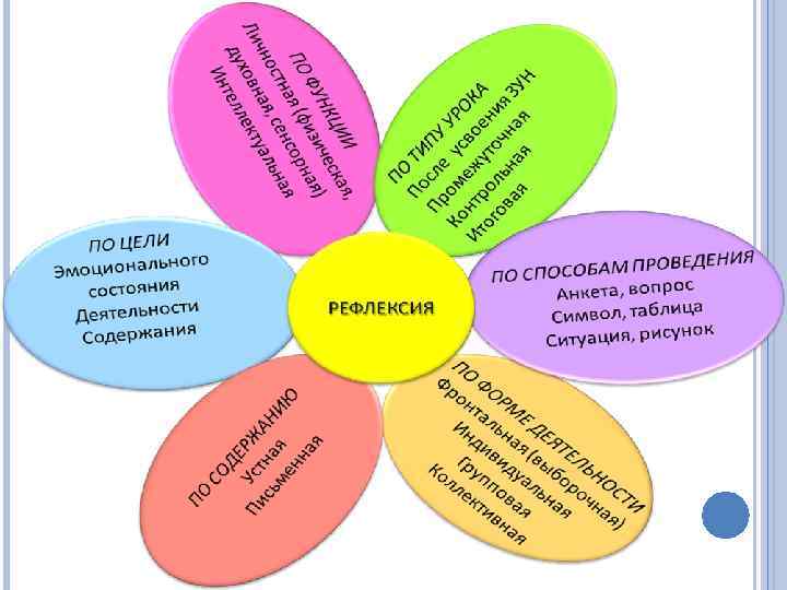 Цель рефлексии вспомнить, выявить и осознать основные компоненты деятельности: ее смысл, типы, способы, проблемы, пути их решения, полученные результаты для повышения эффективности в дальнейшем.