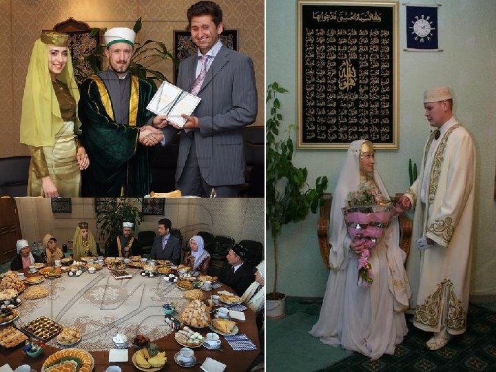 ОТЛИЧИТЕЛЬНЫЕ ЧЕРТЫ МУСУЛЬМАНСКОГО БРАКА • Допустимость многожёнства. • Отсутствие административных формальностей. Торжественная часть представлена исключительно застольем(но не обязательно ). • Крайне желательно присутствие опекуна невесты – отца невесты, при его отсутствии – деда, дяди, брата. Присутствие отца невесты подразумевает его согласие на брак дочери. Для развода необходимо три раза объявить о намерении развестись (произнести "Талак") в присутствии свидетелей. Перед тем, как объявить о новом браке, необходимо выдержать время (иддах).