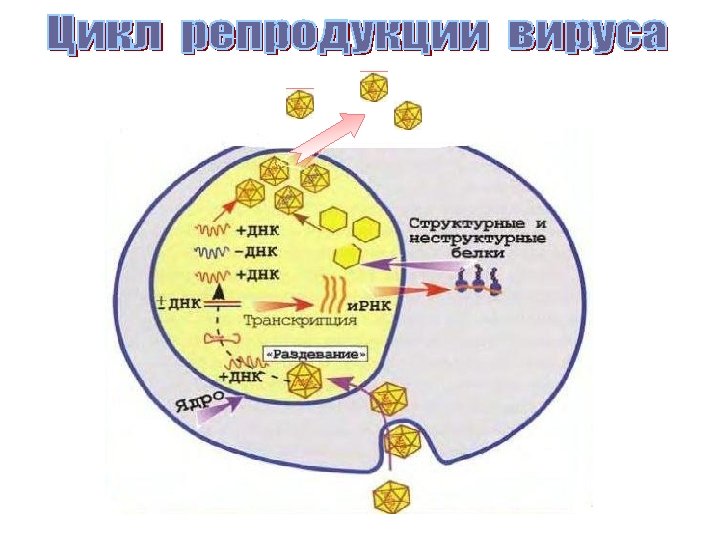 1. Осаждение (адсорбция) вируса на поверхность мембраны клетки, которое возможно только в случае комплементарности клеточной мембраны и капсида вируса 2. Проникновение вируса в клетку возможно двумя путем эндоцитоза, либо путем слияния мембран клеток и вирусов 3. Встраивание генетического аппарата вируса в генетический аппарат клетки-хозяина 4. Подавление генетического аппарата клеткихозяина 5. Синтез вирусных компонентов 6. Самосборка вирусных частиц 7. Выход вирусов из клетки