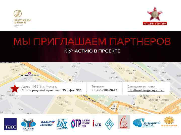 Описание проекта Социально значимый проект «Нашим Героям» - интернет-конкурс «Общественное признание» , является победителем Конкурса Грантов в соответствии с Распоряжением Президента РФ от 17 января 2014 года и реализуется в связи с празднованием 70 - летия Великой Победы Национальным фондом «Общественное признание» при поддержке партнерских, общественных и государственных организаций. Интернет–конкурс «Общественное признание» проекта «Нашим Героям» проводится среди самодеятельных и профессиональных исполнителей и вокалистов, музыкантов и музыкальных коллективов — представителей разных жанров, на лучшее музыкальное произведение, посвященное подвигу нашего многонационального народа в Великой Отечественной войне, памяти погибших защитников Отечества и сохранению воинской Славы России. Победители, активные участники и партнеры интернет – конкурса будут отмечены высокими гражданскими наградами «Общественное признание» , внесенными в Федеральный геральдический регистр и имеющими Свидетельство Геральдического совета при Президенте РФ, а также наградами и специальными призами партнерских министерств и ведомств, общественных, предпринимательских и медийных объединений. «Нашим Героям» - это патриотический проект, направленный на духовную поддержку ветеранов войны и боевых действий, военнослужащих и сотрудников силовых ведомств, а также на утверждение среди молодежи и подрастающего поколения высоких нравственных ценностей и, прежде всего, любви к своему Отечеству, уважению к славной истории нашей Родины, ее погибшим и ныне живущим защитникам. Регистрация на интернет-конкурс «Общественное признание» и более подробная информация о проекте «Нашим Героям» смотрите на сайте www. nashimgeroyam. ru или нашимгероям. рф.