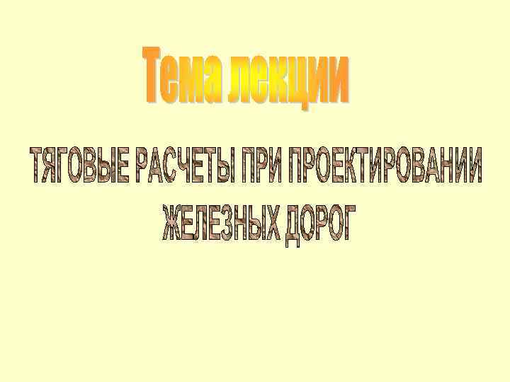 При разработке проекта новой или реконструкции существующей железной дороги решают следующие задачи: • Оптимизация положения трассы в плане и профиле; • выбор основных технических параметров проектируемой линии; • Выбор и назначение путей увеличения провозной способности железной дороги. • Сравнение вариантов проектных решений Для решения этих задач надо располагать алгоритмическими методами, позволяющими определить: • массу поезда при известном продольном профиле и заданном локомотиве; • скорости движения и время хода поезда; • расход электрической энергии или дизельного топлива. Такие методы объединяются общим названием – тяговые расчеты, которые базируются на общих положениях науки о тяге поездов.