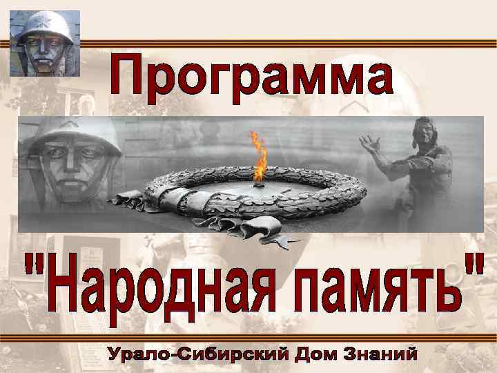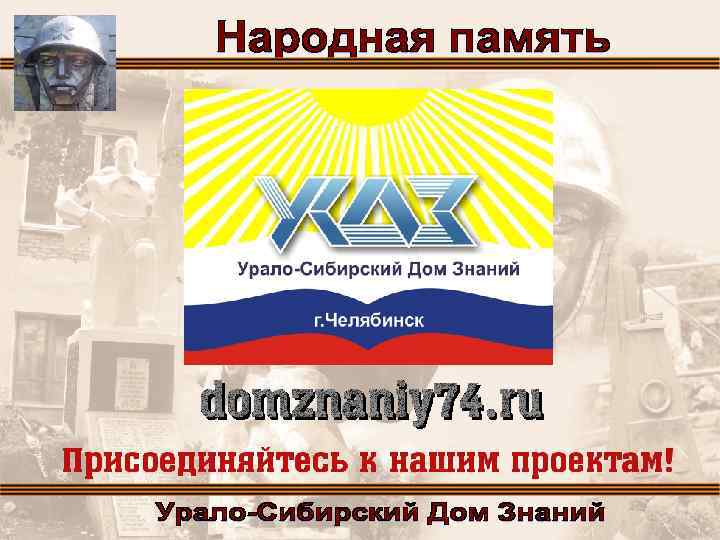 Как принять участие в Программе: 1. Зайти на сайт Урало. Сибирского Дома Знаний domznaniy 74. ru 2. В рубрике «Актуальная тема» найти новость «Народная память» . 3. Скачать форму «Универсальная форма сбора информации об объектах увековечения памяти о Великой Отечественной войне (Универсальная форма)»