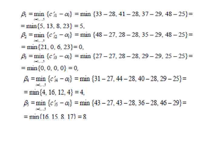 4. Нахождение минимума по столбцам Далее находим в последней таблице минимальные значения в каждом столбце (dj). Эти минимумы выписываем в отдельную строку.