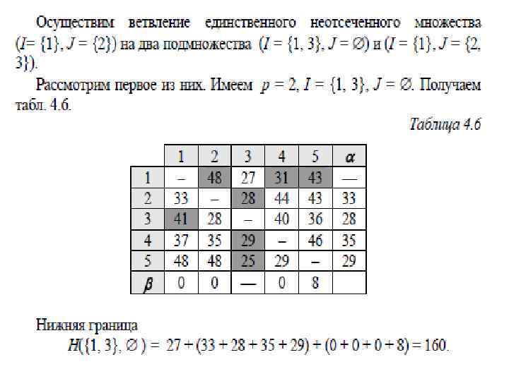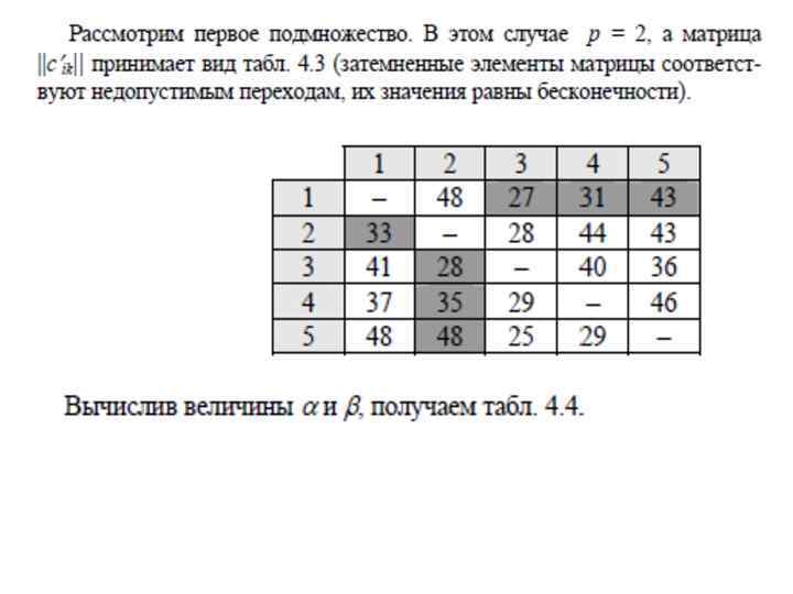 Назовем оценкой нуля в позиции (i, j) в матрице сумму минимальных элементов в i-й строке и j-м столбце (не считая сам этот ноль). Оценим теперь каждый ноль в приведенной матрице: 1 2 3 4 5 6 1 2 — 01 01 — 0 1 3 4 3 1 6 0 3 4 5 6 1 4 4 7 2 5 2 1 — 01 0 3 01 — 1 3 0 1 — 01 3 3 0 —
