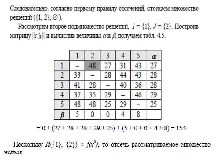следующее: если в тур не будет включен путь из i в j (стоимостью 0), то придется доплатить как минимум k. Поэтому, можно разделить класс всех возможных туров на два: туры, содержащие ребро (i, j) и туры, не содержащие его. Для последних минимальная оценка увеличится на k. Рассмотрим ребро, соответствующее нулю с максимальной оценкой. В данном случае это ребро (1, 2). Таким образом, как только что было замечено, класс всех туров разбивается на два: содержащих ребро (1, 2) и не содержащих его. Нижняя оценка стоимости второго класса туров увеличивается до 35. Чтобы определить оценку для первого класса туров удалим из матрицы строку 1 и столбец 2 (Обозначим ее как C[(1, 2)]):
