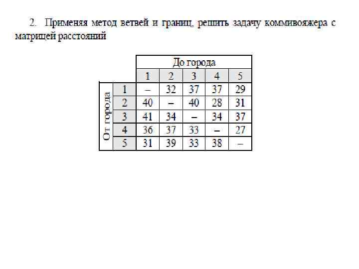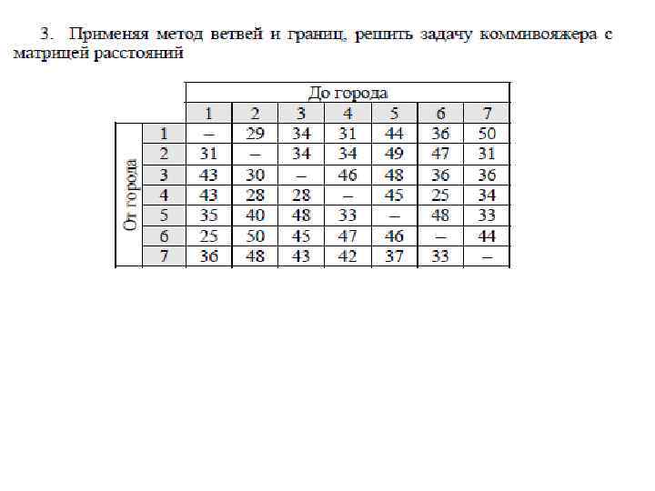 Пример. Применяя метод ветвей и границ, решить задачу коммивояжера с матрицей расстояний, заданной таблицей