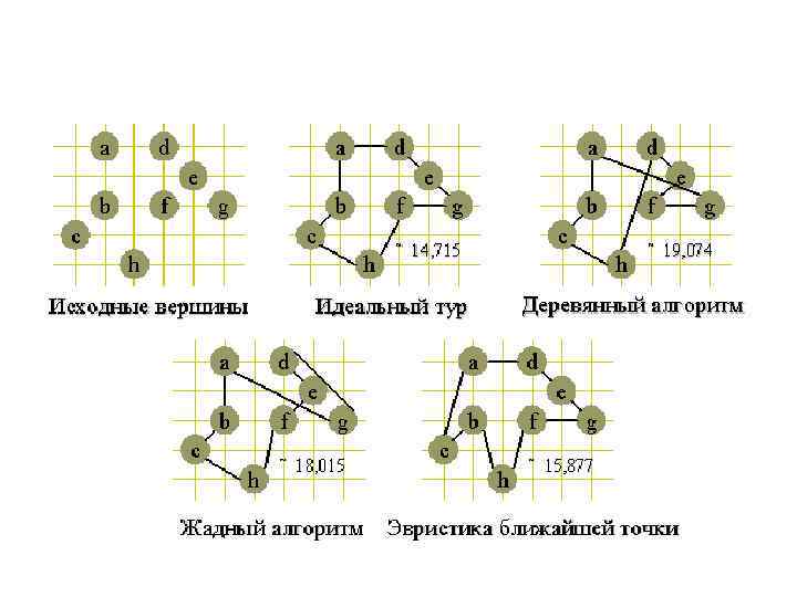 Пример 1. Задача коммивояжера (деревянный алгоритм) Рассмотрим три эвристических алгоритма, решающих симметричную задачу коммивояжера с неравенством треугольника с ошибкой не более чем в два раза (ρ = 2). Первый из них, так называемый деревянный алгоритм, состоит в следующем: построим для нашего графа минимальное покрывающее дерево с помощью алгоритма Прима, а затем совершим обход дерева в порядке root-left-right, удаляя повторяющиеся вершины. Время работы этого алгоритма равно Θ(E) = Θ(V 2).