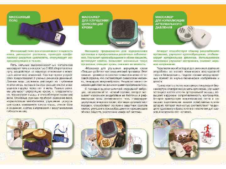 Показания • избыточный вес; • миалгии и невралгии; • ревматический артрит; • радикулит; • остеохондроз позвоночника; • нарушение микроциркуляции в тканях, в том числе при парезах, параличах, рассеянном склерозе и др. ; • синдром хронической усталости; • биоэнергетический дисбаланс; • признаки целлюлита; после родовые растяжки на животе и бедрах; эффект “лимонной корки” на коже; • стимуляция роста молочных желез и сохранение их формы. Пояс не рекомендуется использовать • людям с кардиостимуляторами; • людям, имеющим металлические имплантаты в костях; • беременным женщинам; • людям, перенесшим операции (до 6 месяцев); • при менструациях и дисменорее; • при почечно — каменной болезни; • при тромбофлебитах; • при опухолях разной этиологии.