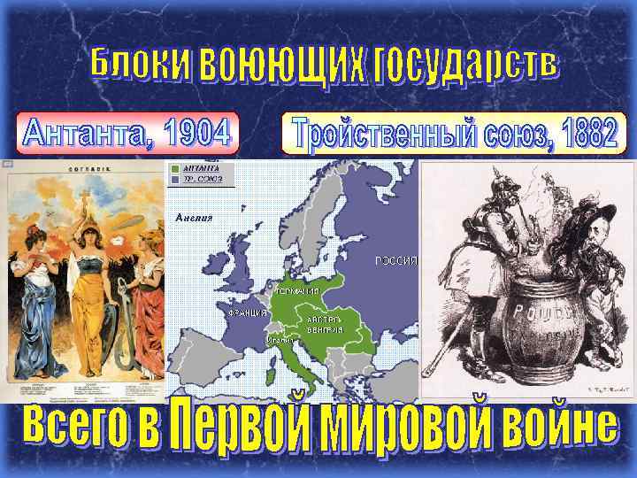 ОСОБЕННОСТИ ПОЛИТИКИ ВЕДУЩИХ СТРАН Франция стремилась заручиться поддержкой Англии и Италии, компромисс в колониальных вопросах Вторая колониальная держава мира, Франция конфликтовала с Великобританией из-за сфер влияния в Центральной Африке и Юго-Восточной Азии Франци я Основным своим противником считала Германию из-за Эльзаса и Лотарингии, которые были утрачены после франко-прусской войны 1870 -1871 гг. и соседством с более сильной в военном отношении Германской империи Большое значение Франция придавала конвенции о взаимопомощи с Россией (1839), предполагавшей оказание военной поддержки другу в случае нападения Германии на одну из сторон