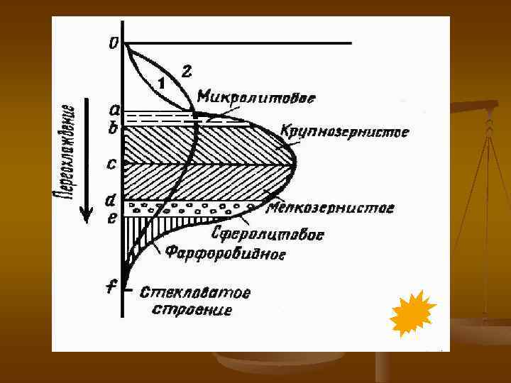 n n n n n Число центров кристаллизации в районе точки плавления очень незначительно, но оно возрастает с увеличением степени переохлаждения, а затем, пройдя максимум, уменьшается и становится равным нулю. Скорость роста кристаллов также мала вблизи точки плавления, увеличивается по мере удаления от нее, переходит через максимум и уменьшается до нуля. При этом максимумы кривых скорости роста кристаллов и скорости образования центров кристаллизации не совпадают, что обусловливает наличие нескольких областей переохлаждения с различной кристаллизационной способностью и соответственно с разными типами структур. При быстром охлаждении магмы поле с малым числом центров кристаллизации может быть пройдено также быстро, и затвердевание происходит в поле с большим количеством центров кристаллизации. Если при этом скорость роста кристаллов небольшая (поле ab), то образуются микролитовые структуры. В поле bc (скорость роста минимальная) образуются крупнозернистые структуры. При уменьшении скорости и дальнейшем переохлаждении – мелкозернистые структуры (поле cd). Если кристаллизация происходит в поле de, где скорость роста мала, возникает сферолитовое строение. В поле ef скорость роста еще меньше, что ведет к образованию скрытокристаллических структур. За пределами поля ef при очень сильном переохлаждении магма не кристаллизуется и затвердевает в виде вулканического стекла.