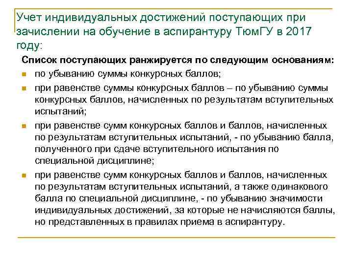 Учет индивидуальных достижений поступающих при зачислении на обучение в аспирантуру Тюм. ГУ в 2017 году: Список поступающих ранжируется по следующим основаниям: n по убыванию суммы конкурсных баллов; n при равенстве суммы конкурсных баллов – по убыванию суммы конкурсных баллов, начисленных по результатам вступительных испытаний; n при равенстве сумм конкурсных баллов и баллов, начисленных по результатам вступительных испытаний, - по убыванию балла, полученного при сдаче вступительного испытания по специальной дисциплине; n при равенстве сумм конкурсных баллов и баллов, начисленных по результатам вступительных испытаний, а также одинакового балла по специальной дисциплине, - по убыванию значимости индивидуальных достижений, за которые не начисляются баллы, но представленных в правилах приема в аспирантуру.