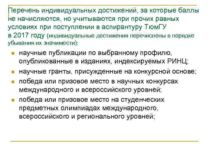 Перечень индивидуальных достижений, за которые баллы не начисляются, но учитываются при прочих равных условиях при поступлении в аспирантуру Тюм. ГУ в 2017 году (индивидуальные достижения перечислены в порядке убывания их значимости): n n научные публикации по выбранному профилю, опубликованные в изданиях, индексируемых РИНЦ; научные гранты, присужденные на конкурсной основе; победа или призовое место в научных конкурсах международного и всероссийского уровней; победа или призовое место на студенческих предметных олимпиадах международного, всероссийского и регионального уровней;