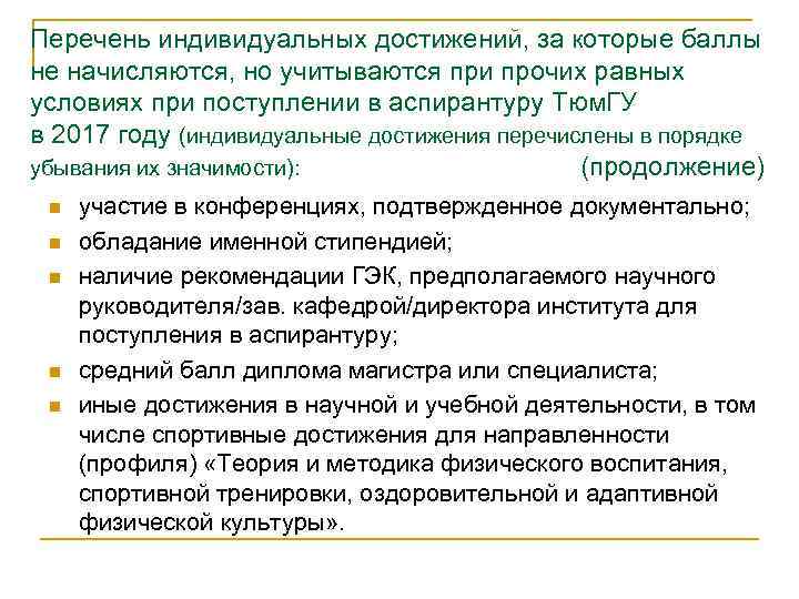 Перечень индивидуальных достижений, за которые баллы не начисляются, но учитываются при прочих равных условиях при поступлении в аспирантуру Тюм. ГУ в 2017 году (индивидуальные достижения перечислены в порядке убывания их значимости): (продолжение) n n n участие в конференциях, подтвержденное документально; обладание именной стипендией; наличие рекомендации ГЭК, предполагаемого научного руководителя/зав. кафедрой/директора института для поступления в аспирантуру; средний балл диплома магистра или специалиста; иные достижения в научной и учебной деятельности, в том числе спортивные достижения для направленности (профиля) «Теория и методика физического воспитания, спортивной тренировки, оздоровительной и адаптивной физической культуры» .