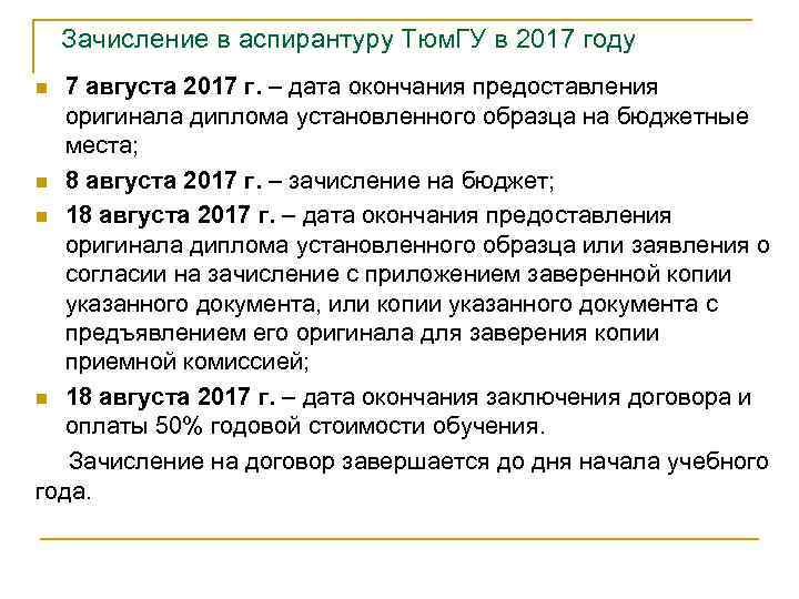 Зачисление в аспирантуру Тюм. ГУ в 2017 году 7 августа 2017 г. – дата окончания предоставления оригинала диплома установленного образца на бюджетные места; n 8 августа 2017 г. – зачисление на бюджет; n 18 августа 2017 г. – дата окончания предоставления оригинала диплома установленного образца или заявления о согласии на зачисление с приложением заверенной копии указанного документа, или копии указанного документа с предъявлением его оригинала для заверения копии приемной комиссией; n 18 августа 2017 г. – дата окончания заключения договора и оплаты 50% годовой стоимости обучения. Зачисление на договор завершается до дня начала учебного года. n