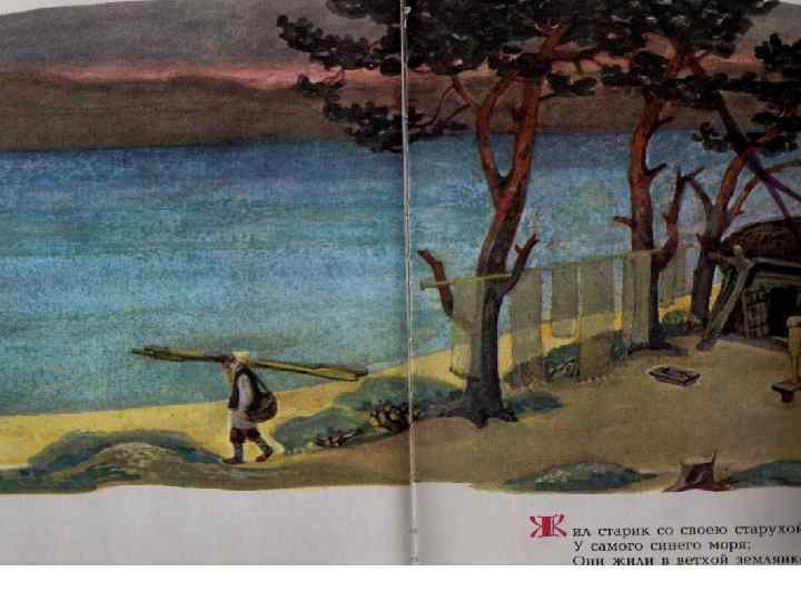 Воротился старик ко старухе, Рассказал ей великое чудо. «Я сегодня поймал было рыбку, Золотую рыбку, не простую; По-нашему говорила рыбка, Домой в море синее просилась, Дорогою ценою откупалась: Откупалась чем только пожелаю. Не посмел я взять с нее выкуп; Так пустил ее в синее море» . Старика старуха забранила: «Дурачина ты, простофиля! Не умел ты взять выкупа с рыбки! Хоть бы взял ты с нее корыто, Наше-то совсем раскололось» . • Вот пошел он к синему морю; Видит, — море слегка разыгралось. Стал он кликать золотую рыбку, Приплыла к нему рыбка и спросила: «Чего тебе надобно, старче? » Ей с поклоном старик отвечает: «Смилуйся, государыня рыбка, Разбранила меня моя старуха, Не дает старику мне покою: Надобно ей новое корыто; Наше-то совсем раскололось» . Отвечает золотая рыбка: «Не печалься, ступай себе с богом, Будет вам новое корыто» .