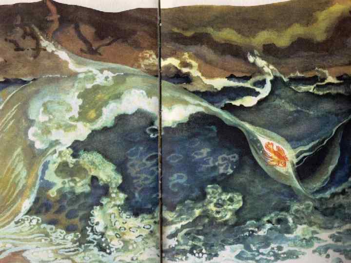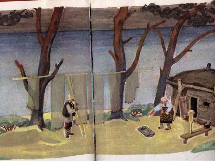Сопоставительный анализ иллюстраций (в группах) 1. Проследите, как меняется колорит иллюстраций, демонстрирующих выполнение очередного желания старухи. 2. Проследите за тем, как изображена старуха: что и почему меняется – одежда, жесты, выражение лица? Меняется ли одежда старика? 3. Как расположены фигуры старика и старухи на каждой из иллюстраций? Есть ли какая-то закономерность в их расположении? 4. Иллюстрации, изображающие старика и старуху, перемежаются с иллюстрациями, изображающими море. Как вы думаете, почему? Чью точку зрения выражает море? Для всех • Почему на последней иллюстрации нарисовано только разбитое корыто, а ни старика, ни старухи, ни землянки нет. Понял ли старик, почему рыбка не выполнила его последнюю просьбу? Поняла ли старуха? А как считаете вы, почему рыбка не выполнила просьбу старика и ничего не сказала ему?