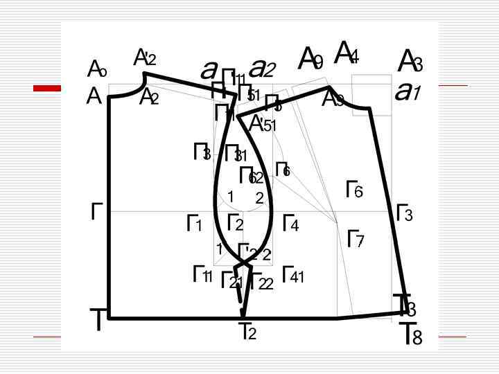 Особенности: o Конструкция выполняется на чертеже основы изделия с втачным рукавом o Увеличивается прибавка Пг : Для платья > 5 см; Для пальто >10 см o Вершину боковой линии размещают посередине проймы Г 1 Г 2=Г 2 Г 4; o Среднюю линию спинки не отводят; o Вытачку в плечевом шве спинке не строят;