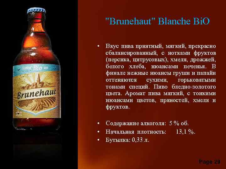 "Brunehaut" Blanche Bi. О • Вкус пива приятный, мягкий, прекрасно сбалансированный, с нотками фруктов (персика, цитрусовых), хмеля, дрожжей, белого хлеба, нюансами печенья. В финале нежные нюансы груши и папайи оттеняются сухими, горьковатыми тонами специй. Пиво бледно-золотого цвета. Аромат пива мягкий, с тонкими нюансами цветов, пряностей, хмеля и фруктов. • Содержание алкоголя: 5 % об. • Начальная плотность: 13, 1 %. • Бутылка: 0, 33 л. Page 29