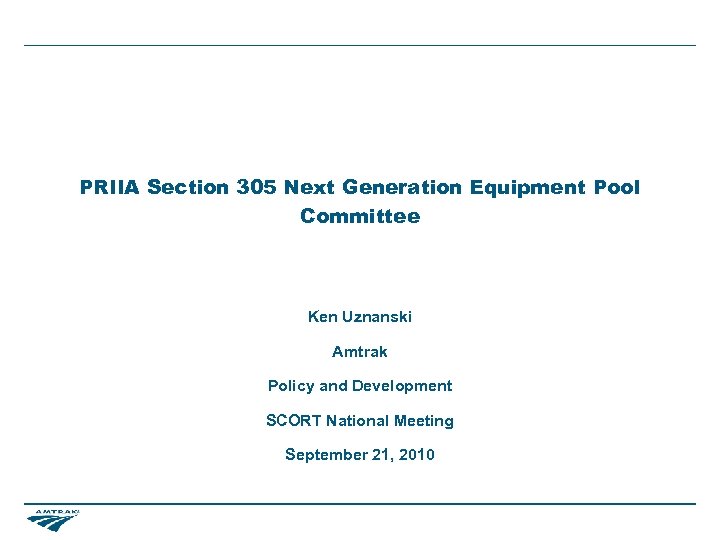 PRIIA Section 305 Next Generation Equipment Pool Committee Ken Uznanski Amtrak Policy and Development SCORT National Meeting September 21, 2010
