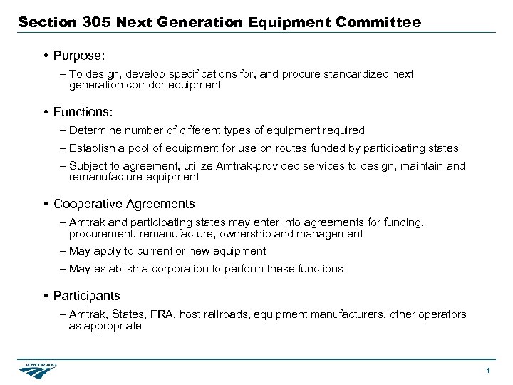 Section 305 Next Generation Equipment Committee • Purpose: – To design, develop specifications for, and procure standardized next generation corridor equipment • Functions: – Determine number of different types of equipment required – Establish a pool of equipment for use on routes funded by participating states – Subject to agreement, utilize Amtrak-provided services to design, maintain and remanufacture equipment • Cooperative Agreements – Amtrak and participating states may enter into agreements for funding, procurement, remanufacture, ownership and management – May apply to current or new equipment – May establish a corporation to perform these functions • Participants – Amtrak, States, FRA, host railroads, equipment manufacturers, other operators as appropriate 1