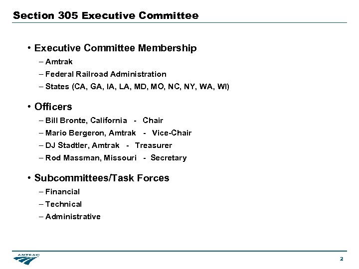 Section 305 Executive Committee • Executive Committee Membership – Amtrak – Federal Railroad Administration – States (CA, GA, IA, LA, MD, MO, NC, NY, WA, WI) • Officers – Bill Bronte, California - Chair – Mario Bergeron, Amtrak - Vice-Chair – DJ Stadtler, Amtrak - Treasurer – Rod Massman, Missouri - Secretary • Subcommittees/Task Forces – Financial – Technical – Administrative 2