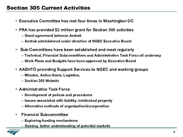 Section 305 Deliverables • Work Plan First Year Deliverables – Complete single-level specifications for corridor services – Complete bi-level specifications – Diesel locomotive specifications – Develop ownership and organizational structures – Determine appropriate procurement strategies – Fleet management strategy – Be prepared for initial procurements • Rolling stock procurements using federal funds will be subject to “Buy America” requirements 3