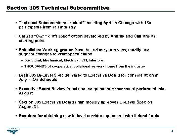 Section 305 Current Activities • Executive Committee has met four times in Washington DC • FRA has provided $2 million grant for Section 305 activities – Grant agreement between Amtrak – Amtrak administered under direction of NGEC Executive Board • Sub-Committees have been established and meet regularly – Technical, Financial Subcommittees and Administrative Task Force all underway – Work Plans and Budgets have been approved by Executive Board • AASHTO providing Support Services to NGEC and working groups – Minutes, Action Items, Logistics, – Section 305 Website • Administrative Task Force – Development of polices and procedures – Issues associated with liability, intellectual property – Alternative methods of organization/incorporation • Financial Subcommittee – Exploring funding mechanisms – Gaining better understanding of potential markets 4