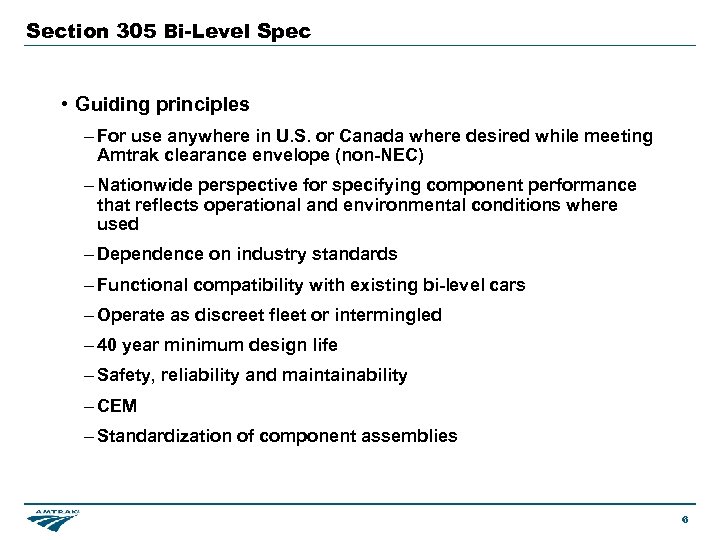 Section 305 Technical Subcommittee • Technical Subcommittee “kick-off” meeting April in Chicago with 150 participants from rail industry • Utilized “C-21” draft specification developed by Amtrak and Caltrans as starting point • Established Working groups from the industry to review, modify and suggest changes to draft specification – Structural, Mechanical, Electrical, VTI, Interiors – THOUSANDS of cooperative, collaborative work hours from the industry • Draft 305 Bi-Level Spec delivered to Executive Board for consideration in July - On Schedule • Executive Board Review Panel and Independent Assessment performed mid. August • Section 305 Executive Board unanimously approves Bi-Level Spec on August 31. • Required for obtaining new bi-level corridor equipment with federal funds 5