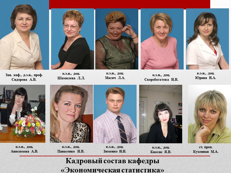 Кадровый состав кафедры «Экономическая статистика» Зав. каф., д.э.н., проф. Сидорова А.В. к.э.н., доц. Шамилева Л.Л. к.э.н., доц. Масич Л.А. к.э.н., доц. Скоробогатова Н.В. к.э.н., доц. Юрина Н.А. к.э.н., доц. Анисимова А.В. к.э.н., доц. Панасенко И.В. к.э.н., доц. Зименко Н.И. к.э.н., доц. Киосак Я.В. ст. преп. Кухенная М.А.