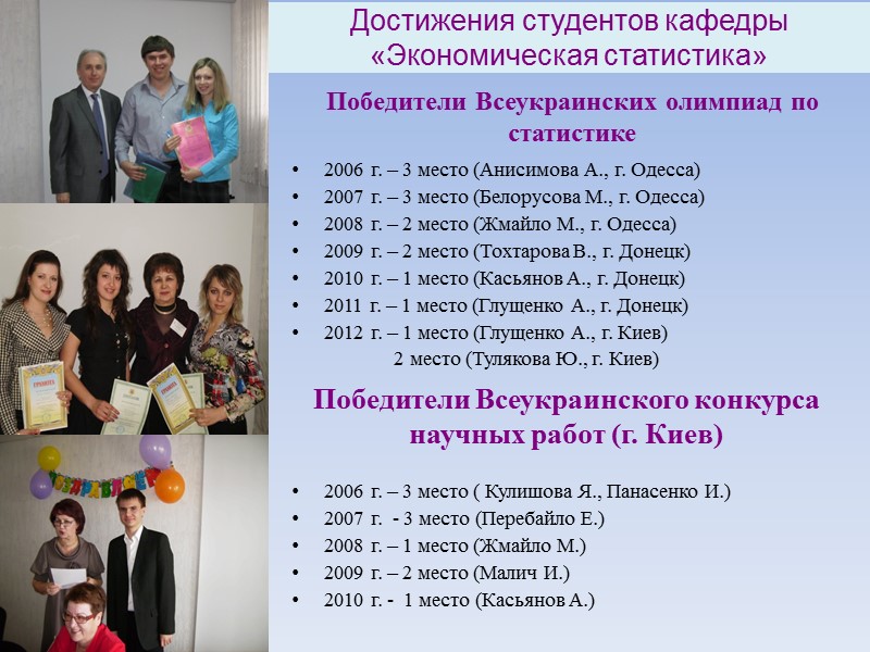 Победители Всеукраинских олимпиад по статистике 2006 г. – 3 место (Анисимова А., г. Одесса) 2007 г. – 3 место (Белорусова М., г. Одесса) 2008 г. – 2 место (Жмайло М., г. Одесса) 2009 г. – 2 место (Тохтарова В., г. Донецк) 2010 г. – 1 место (Касьянов А., г. Донецк) 2011 г. – 1 место (Глущенко А., г. Донецк) 2012 г. – 1 место (Глущенко А., г. Киев) 2 место (Тулякова Ю., г. Киев) 2006 г. – 3 место ( Кулишова Я., Панасенко И.) 2007 г. - 3 место (Перебайло Е.) 2008 г. – 1 место (Жмайло М.) 2009 г. – 2 место (Малич И.) 2010 г. - 1 место (Касьянов А.) Победители Всеукраинского конкурса научных работ (г. Киев) Достижения студентов кафедры «Экономическая статистика»