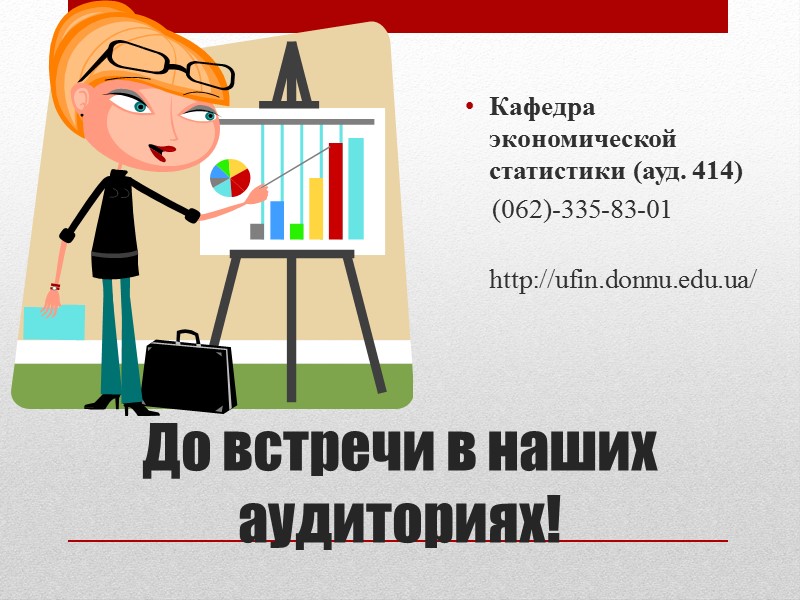 До встречи в наших аудиториях! Кафедра экономической статистики (ауд. 414) (062)-335-83-01 http://ufin.donnu.edu.ua/