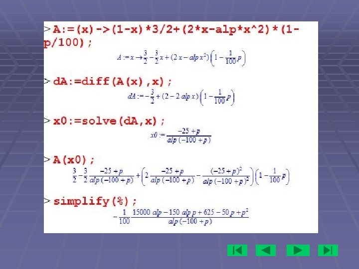 Чтобы x 0 принадлежало отрезку [0; 1], необходимо выполнение условия . Таким образом, если . , то выгоднее ничего не вкладывать в производство и разместить весь капитал в банк. Если , то можно показать, что при x=x 0, A(x 0)>A(0), т. е. вложение в производство является более выгодным, чем чистое размещение в банке под проценты. В системе Maple с помощью функции solve решим уравнение A’(x)=0 и найдем точку экстремума x 0; найдем максимальное значение функции A(x), равное A(x 0).