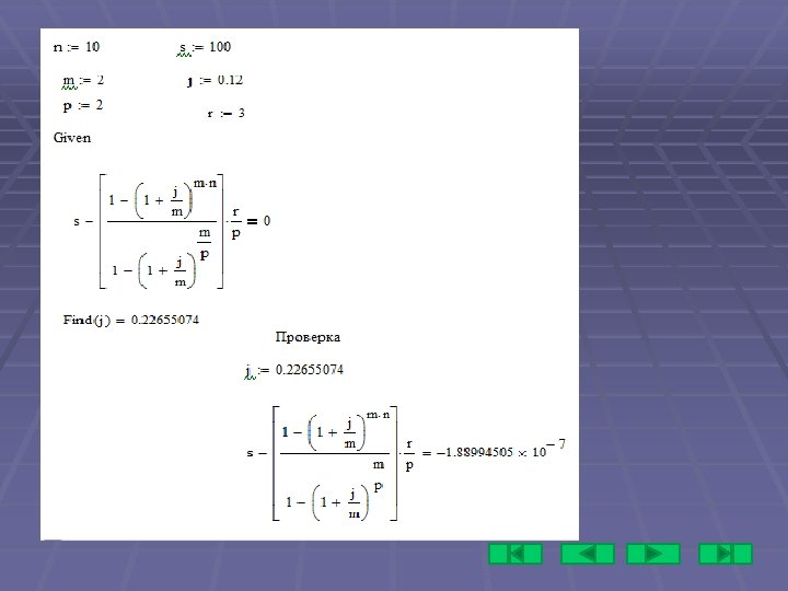 Финансовые расчеты в Math. CAD Рассмотрим ряд примеров из финансовой математики, где требуется применение методов вычислений. üОпределение уровня процентной ставки. üВычисление наращенных сумм на основе непрерывных процентных ставок